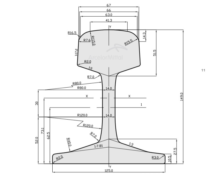 Carril modelo 49E5 fabricado según la norma europea EN 13674-1. Es un carril de sección tipo T (flat botom rails) con una masa de 49,13 kg por metro.