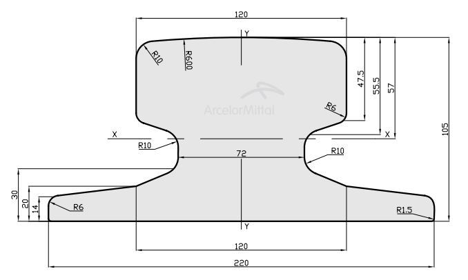Carril modelo A120 fabricado según las Normas Europeas DIN 536 P1:1991 con una masa de 100 kg/metro.