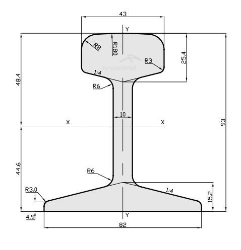 Carril modelo S18 fabricado según la norma europea EN-13674-4, con una masa de 18,20 kg por metro.