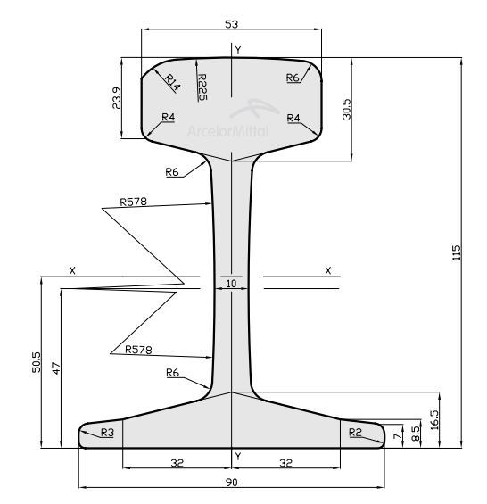 Rail modelo S24 fabricado según las norma europea EN-13674-4; con una masa de 24,40 kg por metro.