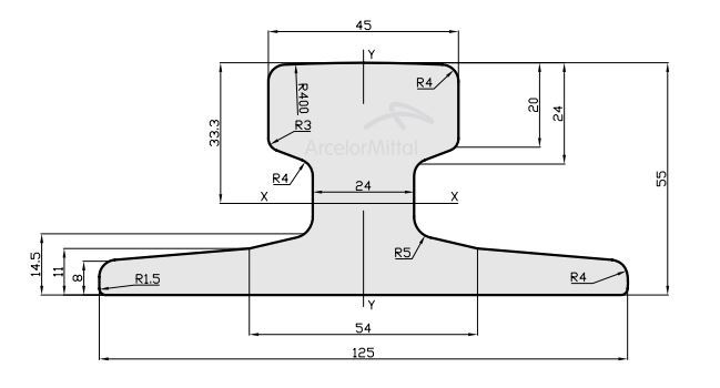 Crane rail A45 manufacture according to European Standard DIN 536 P1:1991 with mass of  22,10 kg/m.