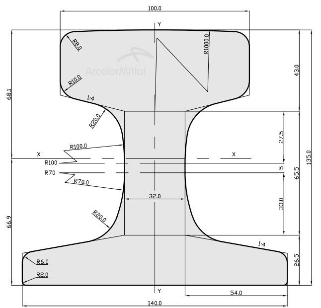 Crane rail CR73 manufacture according to ArcelorMittal Specifications with mass of 73,30 kg/m.