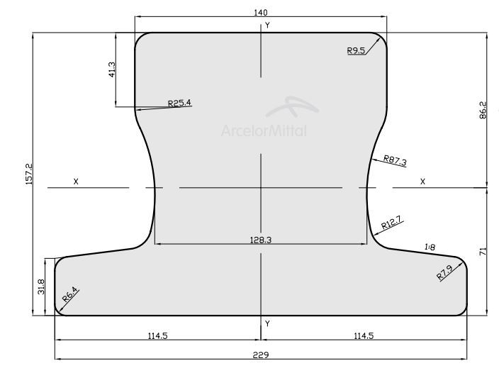 Crane rail MRS192 manufacture according to ArcelorMittal Specifications with mass of 192 kg/m.
