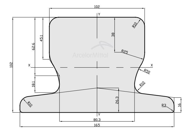 Crane Rail MRS86 manufacture according to ArcelorMittal Specifications with mass of 85,50 kg/m.