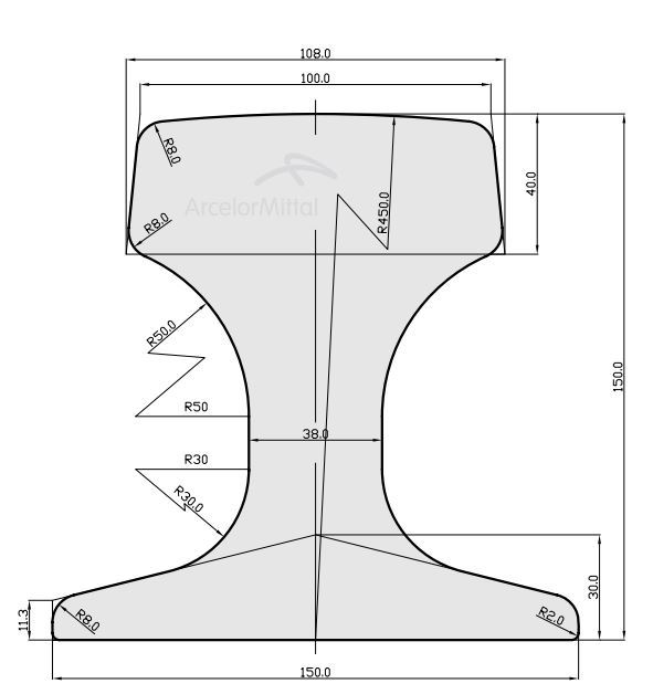 Crane rail SP100 manufacture according to ArcelorMittal Specifications with mass of 89,05 ​ kg/m.