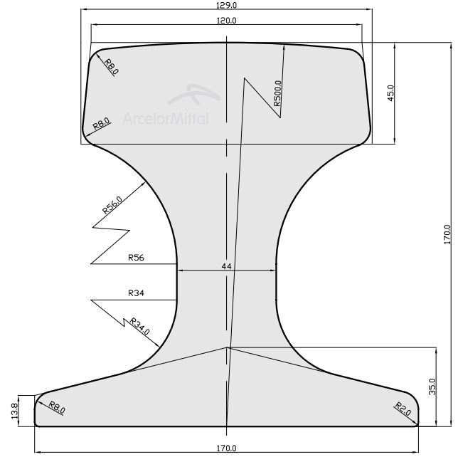 Crane rail SP120 manufacture according to ArcelorMittal Specifications with mass of 118,28 kg/m.