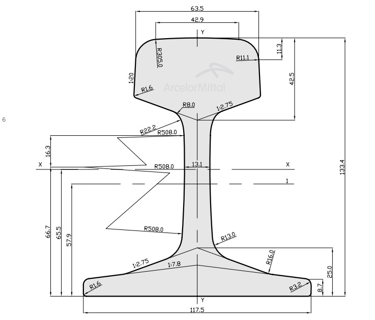 Rail profile 39E1 (BS80A) manufactured according European Standard EN 13674-4. Mass of 39,77 kg per meter.