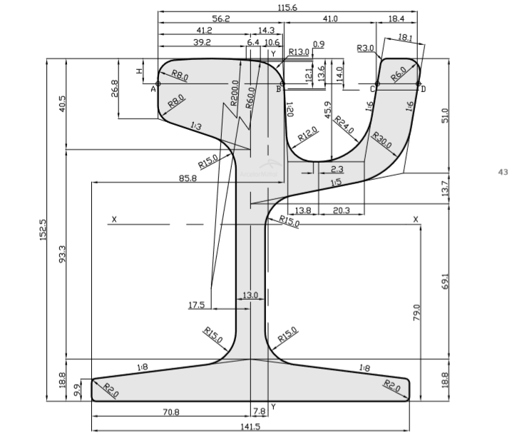 Rail profile 54G1/54R1 (41GPU) manufacture according European Standard EN 14811, within G or R tolerance group manufacturing categories. These group categories are involved in measuring rail verticality which becomes of importance for adjusting track width, embedding material interaction and to have best rail/wheel contact performance.