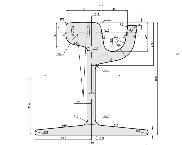 Rail profile 59R1 (Ri59) manufacture according European Standard EN 14811, within G or R tolerance group manufacturing categories. These group categories are involved in measuring rail verticality which becomes of importance for adjusting track width, embedding material interaction and to have best rail/wheel contact performance.