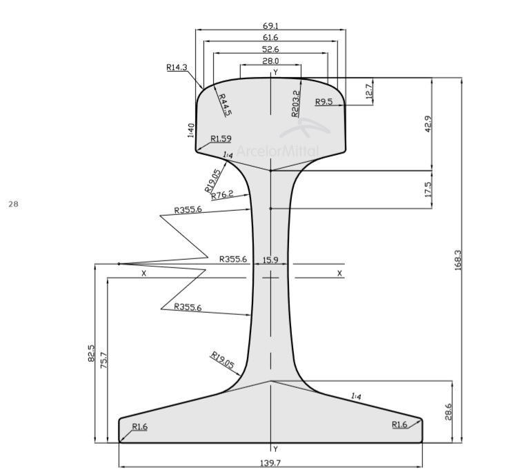 | 115RE (TR57) | AREMA | 168,3 | 139,7 | 69,1 | 42,9 | 15,9 | 72,58 | 56,9 |