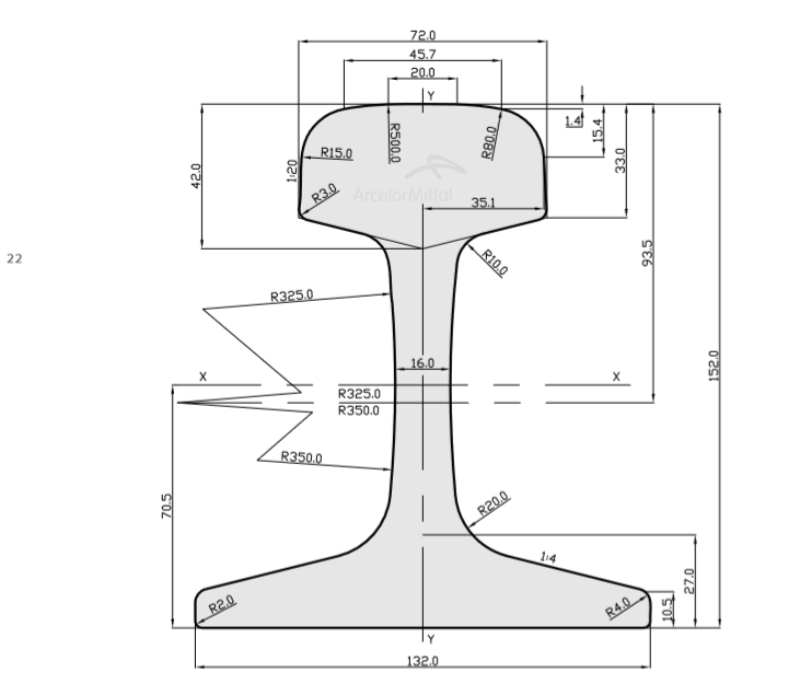 Rail modelo R50 (P50) manufactured according Russian Standard Gost P51685, mass 51,80 kg per meter.